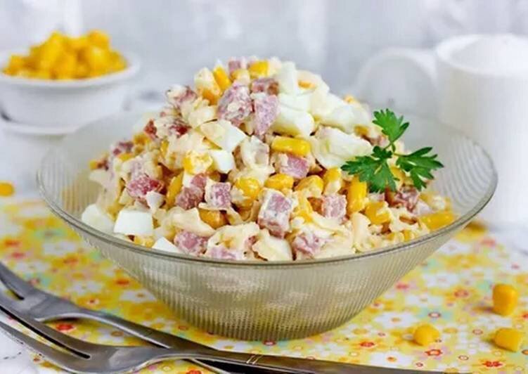 Соединить колбасу, сыр, яйца и кукурузу.