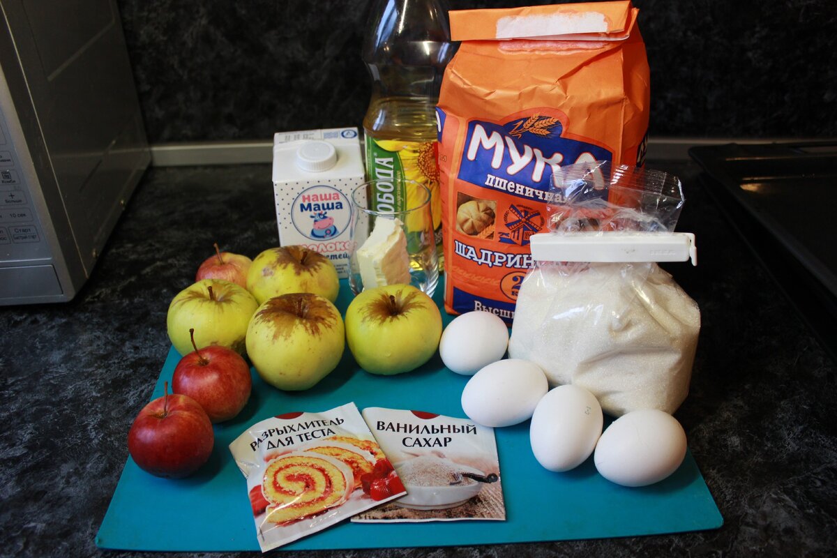 Для теста: яблоки 4-5 шт., мука 200 гр., яйца 3 шт., сахар 120 гр., ванильный сахар 10 гр., разрыхлитель 1,5 ч. л., молоко 100 мл., растительное масло 3 ст. л.