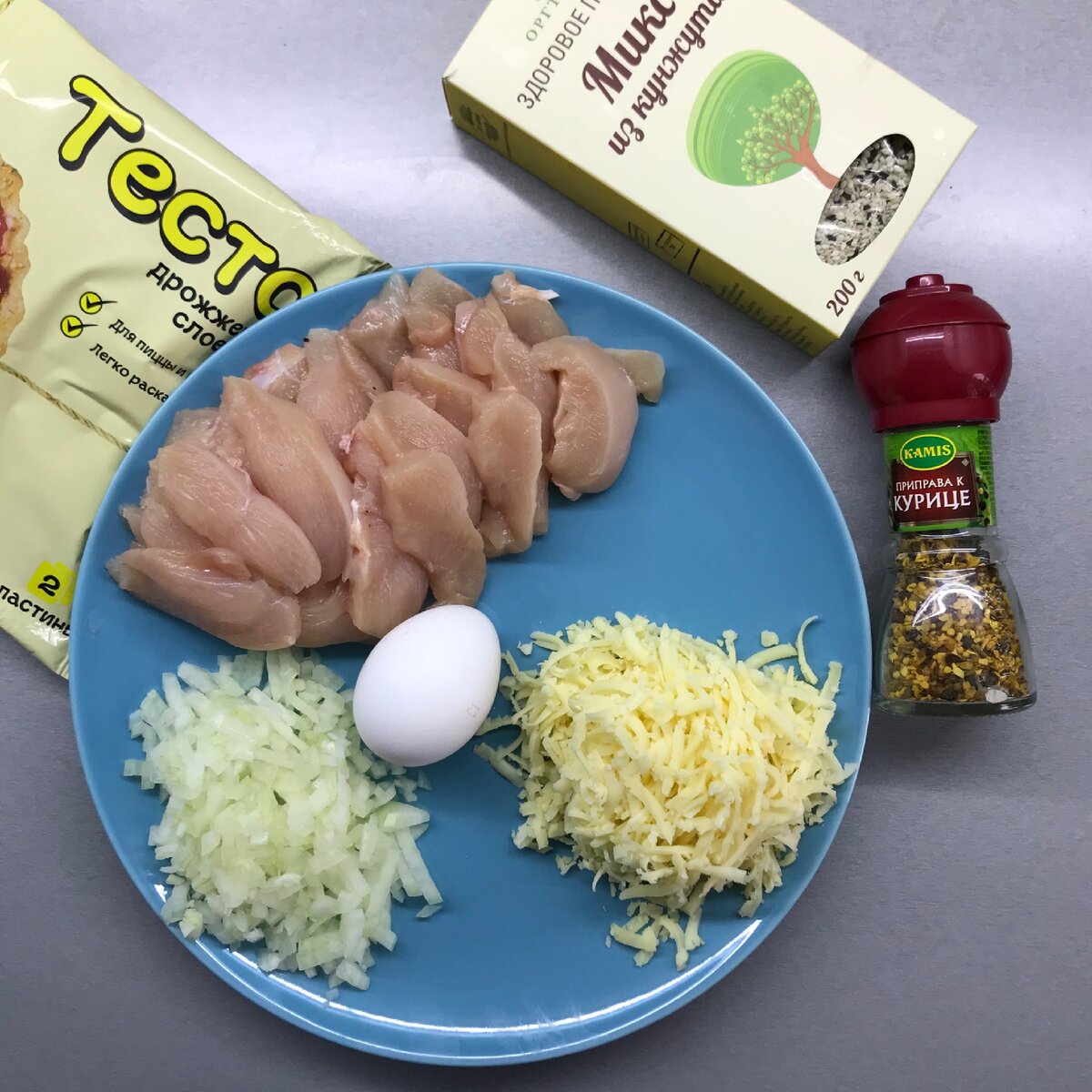 На тесто выложить обжаренный лук, на лук курицу, посолить, поперчить и добавить приправу для курицы по вкусу.