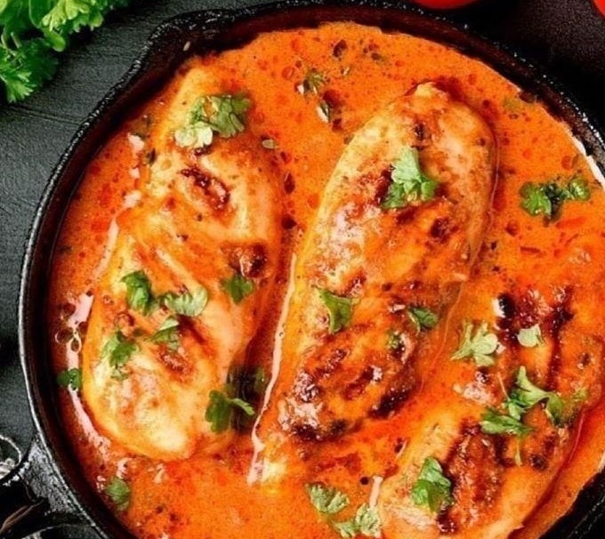 Поверх выложить филе. Хорошо его промазать йогурто-томатной смесью, накрыть форму фольгой и дать промариноваться в холодильнике 2-3 часа.