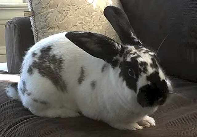 Самый крупный кролик породы бабочка - это пестрый великан. У него удлиненное туловище длиной до 66 см, а белый окрас сопровождают узоры черного и голубого цвета.