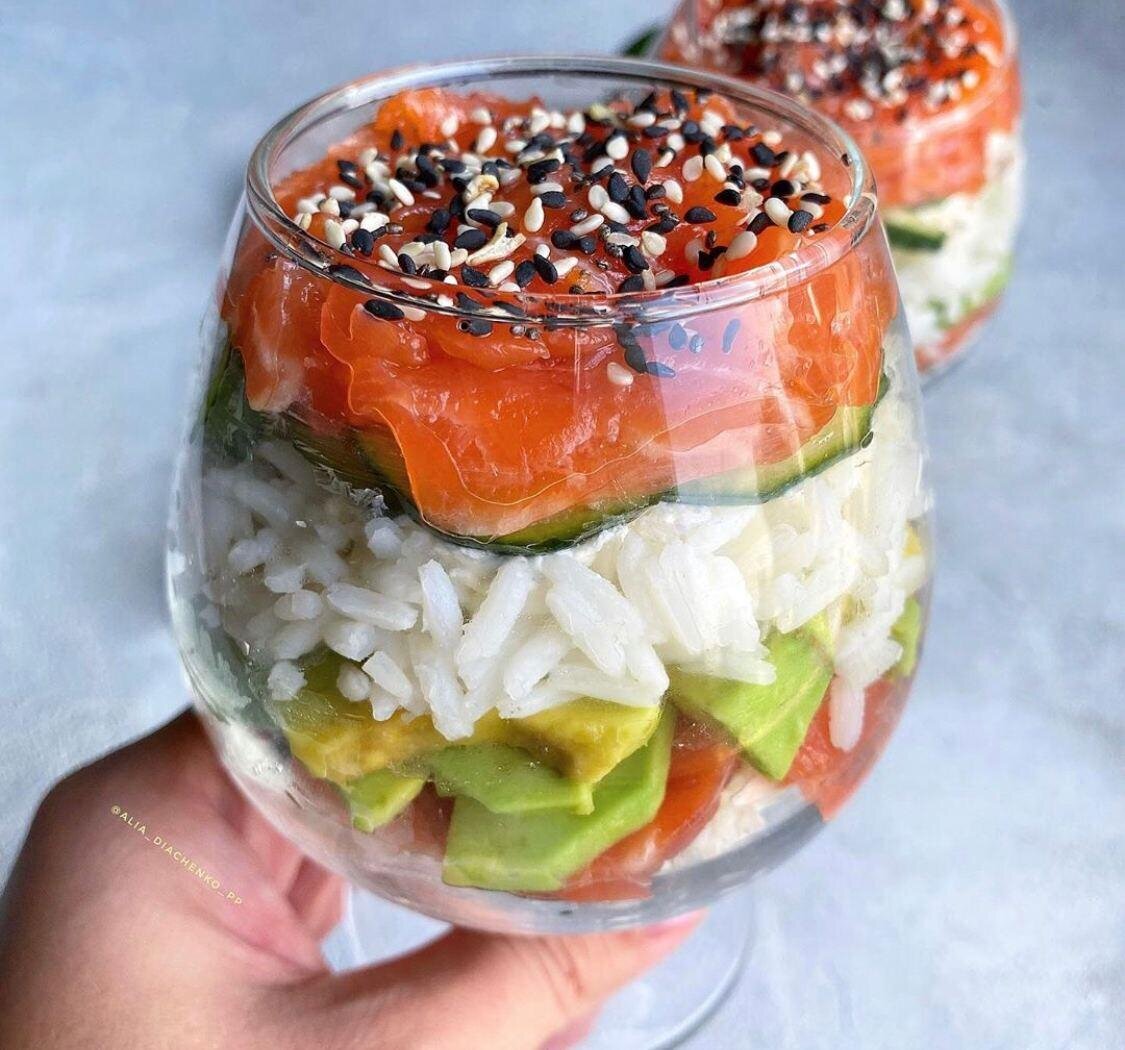 Собираем салат: рис, сыр, огурец, рыба, авокадо, рис, сыр, огурец, рыба, кунжут.