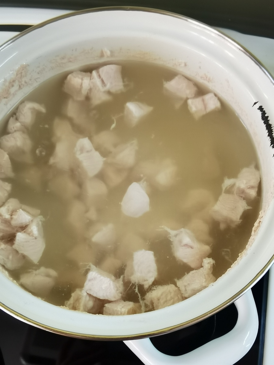У меня была куриная грудка (я из неё приготовила не только суп, смотри ниже), я мразе часть этой грудки порезала на кубики и отправила варить.