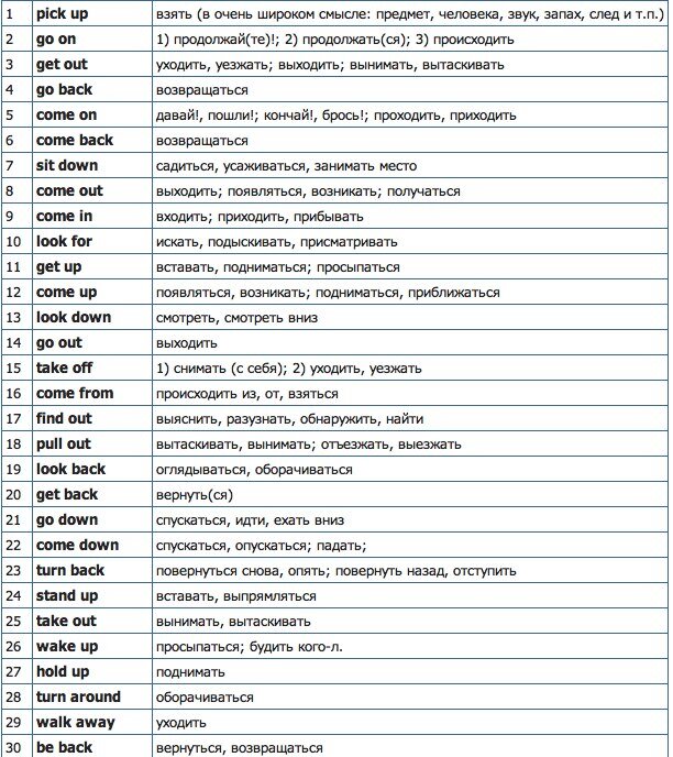 Наверняка многие слышали это сочетание "фразовые глаголы". Но что же это такое? Фразовый глагол - это комбинация глагола и предлога, глагола и наречия, либо одновременно глагола и предлога с наречием, которая является одним членом предложения и образует таким образом цельную семантическую единицу. Чаще всего фразовые глаголы трудно перевести в прямом смысле, их просто надо заучивать. А вот и основные фразовые глаголы, зная которые, вы будете понимать очень много текстов и смысл многих фраз