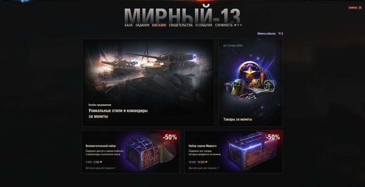 Цена: 10 000, доступен для покупки 1 раз.Также просто в Магазине (не во вкладке режима) есть ещё 3 набора для Мирного. Магазин == Товары Мирного-13 (1 вкладка). Здесь вообще находятся все возможные наборы.