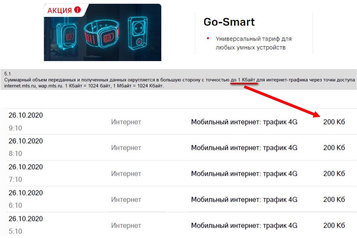 Я обнаружил, что МТС на тарифе Go Smart обещает тарифицировать интернет-трафик по 1 КБ, но в детализации показывает списания по 200 КБ.