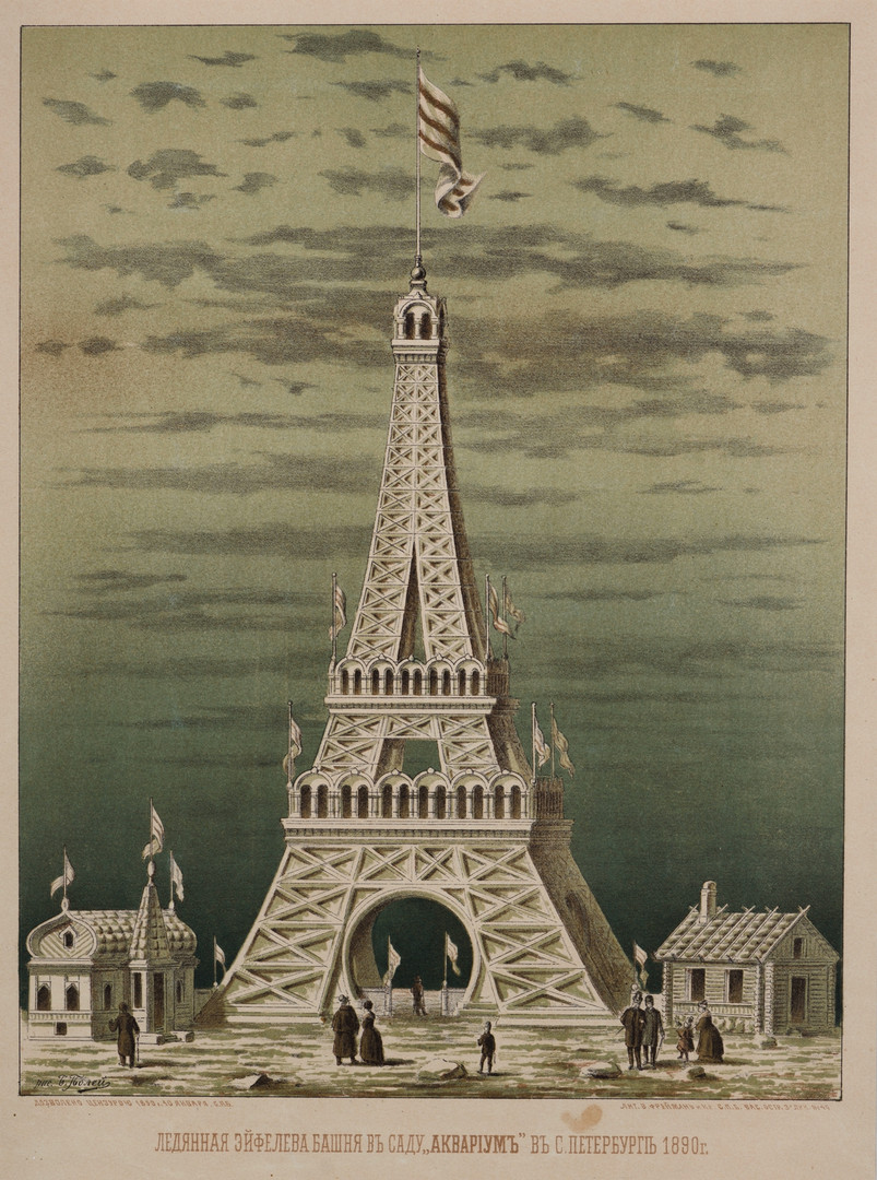 В 1890 году в Санкт-Петербурге и правда появилась Эйфелева башня. Только она кардинально отличалась от своего французского прототипа — она была сделана изо льда. Сооружением подобных ледяных архитектурных памятников славился сад «Аквариум» в Санкт-Петербурге. Купец первой гильдии, Георгий Александров, арендовал территорию на Каменноостровском проспекте, разбил там сад и заказал огромный аквариум для демонстрации рыб и разных пресмыкающихся. Но проект большого аквариума так и не был реализован. Вместо него Александров построил театр, ресторан, развлекательные павильоны и даже каток с искусственным льдом. Но одной из любимых потех горожан были вот такие сооружения. Даже сейчас это кажется чем-то совершенно невообразимым! Ледяная архитектура, музыкальные и театральные представления стали настолько популярными, что вскоре народ забыл про аквариум, но продолжили называть так сад. Вот название и осталось. Аквариум «...был местом, где царит вечный праздник, смех и песни, где перед зрителем пр
