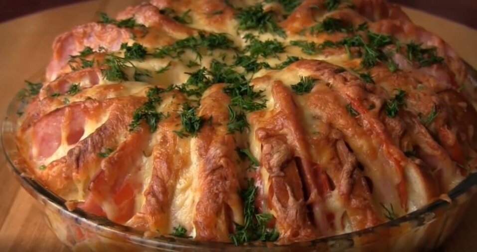 Между ломтями белого батона выложить дольки помидора, ветчины.