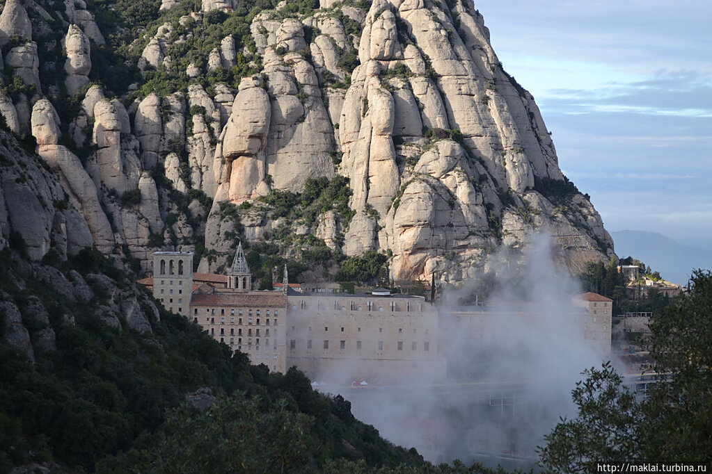 Час пути — и преодолены 50 километров, что отделяют Барселону от монастыря. Погода "не шепчет". Забыты яркое солнце, голубое небо, которые баловали меня последние несколько дней. Низкая облачность, сильный ветер, периодически бросающий в лицо брызги дождя — новая суровая реальность. Но даже немилость погоды не способны преуменьшить красоту окрестностей монастыря и самих монастырских построек, словно втиснутых чьей -то властной рукой в окружающий горный ландшафт.Монастырь Монсеррат — горами зажат.