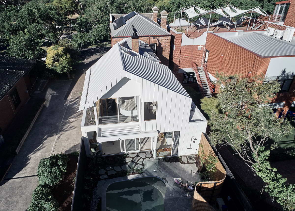 Построенный в 1876 году, Lantern House раньше имел тёмный и мрачный интерьер и его новые владельцы — молодая пара с двумя детьми и собакой — очень хотели дом с открытой планировкой. Расширение с низким потолком, которое было добавлено в 1980-х годах, также не устраивало молодую семью. После сноса существующего расширения, студия создала современное дополнение двойной высоты, которое полностью покрыто белыми стальными панелями. Оно имеет прямолинейное основание со стеклянным фасадом и остроконечный верхний объем, обёрнутый широкими окнами, которые отбрасывают полосы света внутрь. Их также можно увидеть светящимися с уровня улицы, когда наступает ночь. Благодаря яркому качеству нового расширения проект получил название Дом-фонарь. Это также было тонким намёком на японские тёры — традиционные фонари, сделанные из камня, дерева или металла, которые используются для освещения путей в буддийских храмах. Разработанный, чтобы иметь успокаивающую, «непритязательную» атмосферу, интерьер расшире