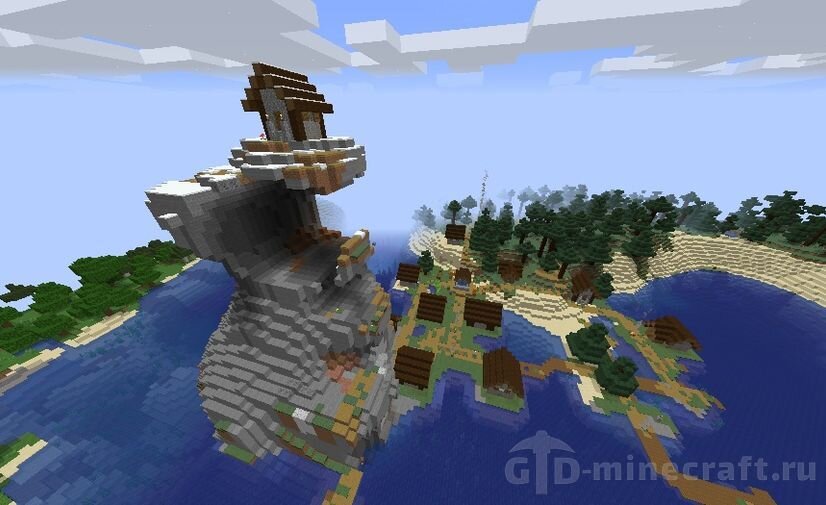 Какая уникальная находка для семени! Вы появляетесь на острове с гигантской тайгой и грибным биомом. Тайга – отличные биомы, чтобы найти себе домашнюю лису если вы ищете легкого общения. Если вы отодвинетесь от него, вы увидите, что этот остров имеет форму осьминога / кальмара! Это действительно потрясающий макет, и он отлично подходит для начала вашей базы. В лесной зоне есть овраг хорошего размера для поиска первых ресурсов. Вы также найдете Океанский памятник, не так далеко!