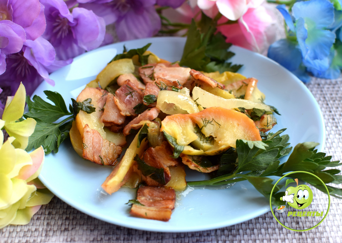 Очень подходящий рецепт, когда нужно быстро приготовить вкусное горячее мясное блюдо, готовая варено-копченая грудинка обжаривается всего за несколько минут. А яблоки придают оригинальный вкус. Важно даже не обжаривать дольше, чем указано в рецепте, иначе грудинка пережарится, подсохнет и потеряет свою сочность.
