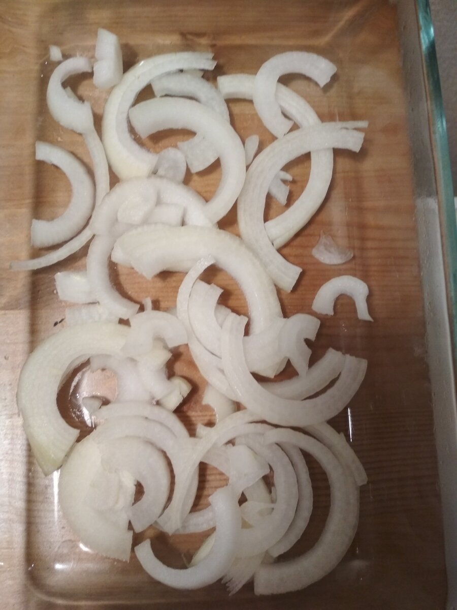 Лук порезать полукольцами и выложить в форму для запекания