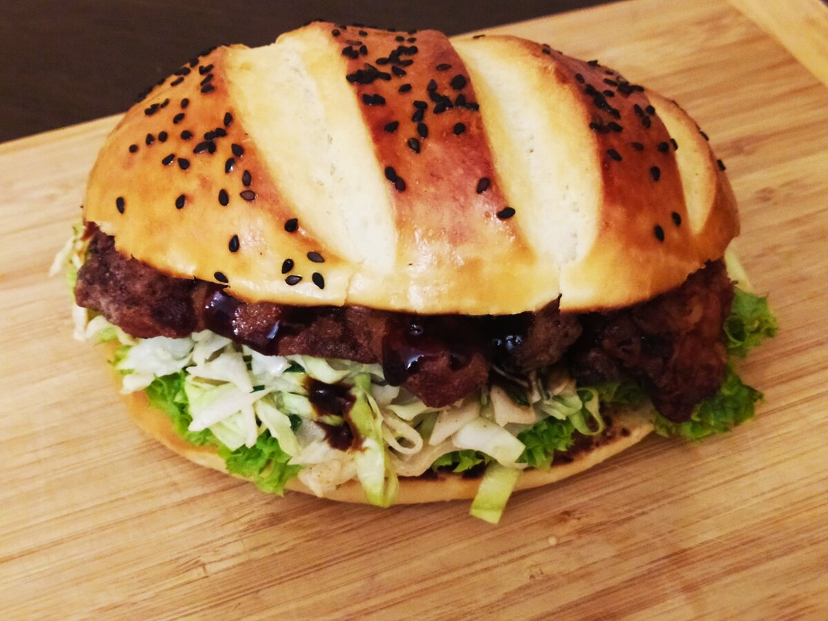Сэндвич с хрустящей жареной курицей, салатом из капусты и дайкона, и соусом в корейском стиле.
