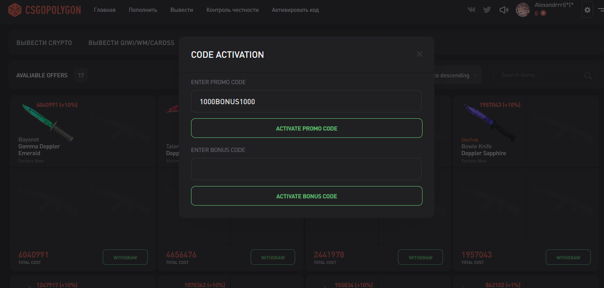 Этот код даст вам 1000 монет, которые вы можете, либо поиграть на этом сайте и вывести большую сумму или сразу вывести скин за 1$