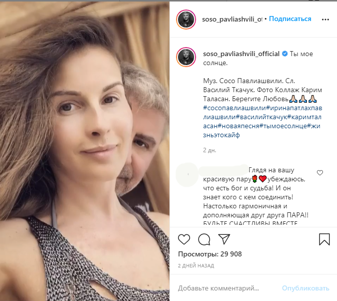 На днях Сосо Павлиашвили представил пользователям соцсетей свою новую песню "Ты мое солнце". Певец выложил видео, в котором под новый трек чередуются милые фотографии Сосо с женой Ириной. Поклонники тепло восприняли новую песню артиста. В комментариях пользователи Instagram пожелали счастья и долгих лет жизни счастливой паре.