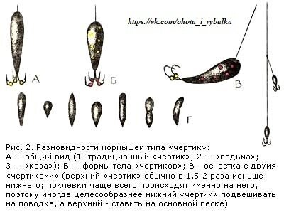 "Чертик" предназначен для ловли рыб без насадки. Но эту мормышку можно принарядить: нацепить на крючки тонкие кембрики или маленькие разноцветные бусинки. Цвет кембриков или бусинок оказывает влияние на уловис-тость мормышки и подбирается опытным путем.