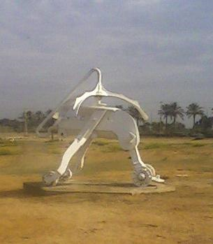 Вот только на поток поставлено подобное творчество. Один выбор материала чего стоит! – Конструкционная сталь, которая ржавеет и лишь в машинах путём технического обслуживания их сколько-то лет служит цели. Она, правда, дешева, не в пример нержавеющей стали. Ну так пусть будет дешёвое. Покрасим-де. Пипл схавает. (Как когда-то на заре советской власти в России фанерные монументы ставили, при «жизни, льющейся через край».) Вглядевшись в покраску, видишь даже затвердевшие потёки масляной краски, что произошли от, казалось бы, нерадивости маляра. Но это не нерадивость. Потеками же выведен год создания и фамилия автора (1990, Рапопорт). Я не знаю, был ли сварщиком и маляром создатель объекта, но запись сделана-то с его ведома. Наверно же, в его присутствии, если и не его руками. И потёки масляной краски в других местах тогда есть то же, что и плохо зачищенные сварные швы и сам выбор материала – быстро ржавеющей стали. Это халтура творения, избегающая немодного, устаревшего, мол, искусного исполнения. Может, и принципиальная халтура, коль творение – для массового общества так называемого цивилизованного мира на рубеже ХХ-XXI столетий. Да. Массового. В передовом касательно моды Нью-Йорке в музей с абсурдистскими вещами очередь стоит (публика озабочена декортивными задачами в собственных своих домах и дворах). Так и израильтян, мол, - думает Рапопорт, - надо тянуть в цивилизацию. В глобализацию. И удаётся: они уже находят (спрашивал) нормальным наводнение улиц и площадей этакими абсурдистскими объектами, некоторые из которых сделаны нескрываемо халтурно.