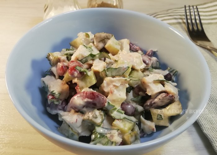 Затем в салатнике соединяю все указанные выше ингредиенты и красную консервированную фасоль.