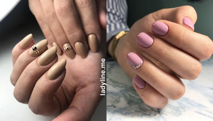 Актуальные короткие ногти выглядят опрятно и стильно с маникюром нежно-розового цвета, который можно разнообразить с помощью мелких страз на одном или нескольких ногтях.