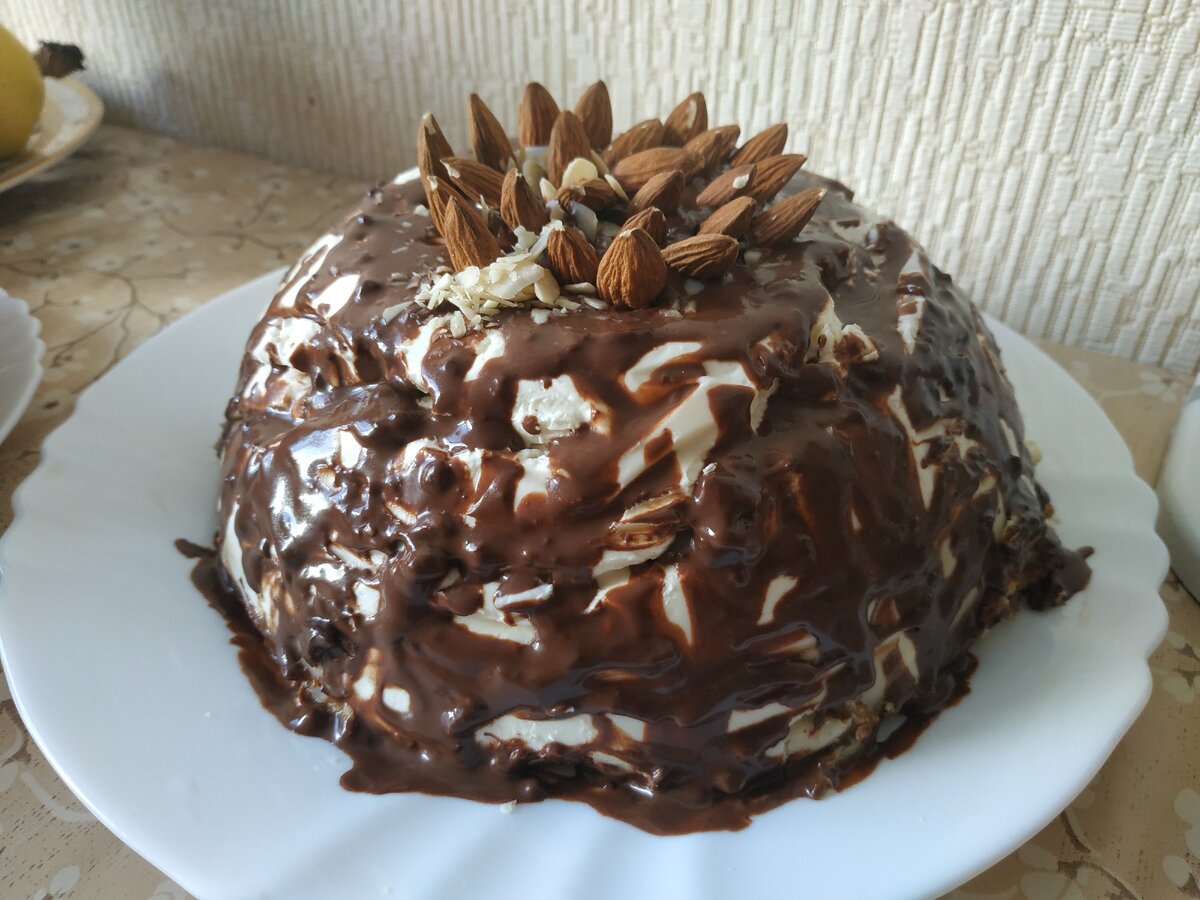 9 . Растопим горячий шоколад и украсим им торт. Можно добавить орешки или украсить на свой вкус.