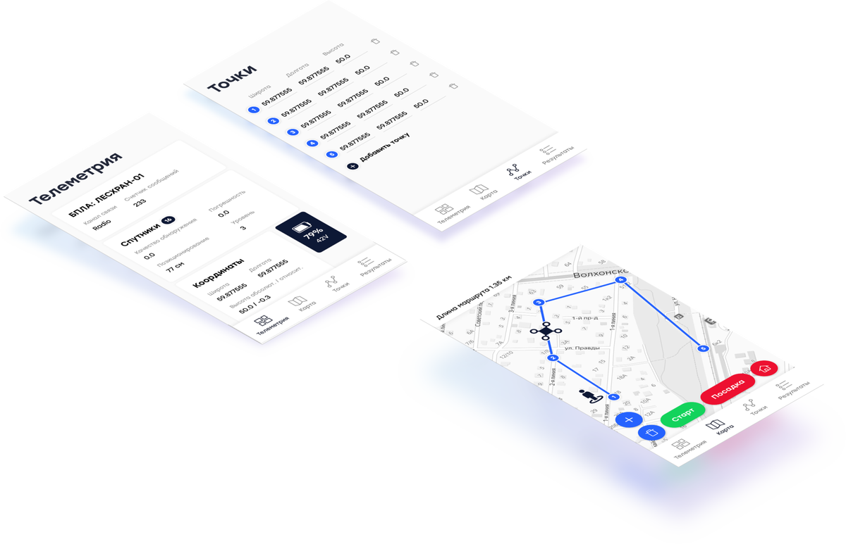 - возможности отследить местоположение квадрокоптера в любой из моментов времени, метеоусловия и отклонения от маршрута.