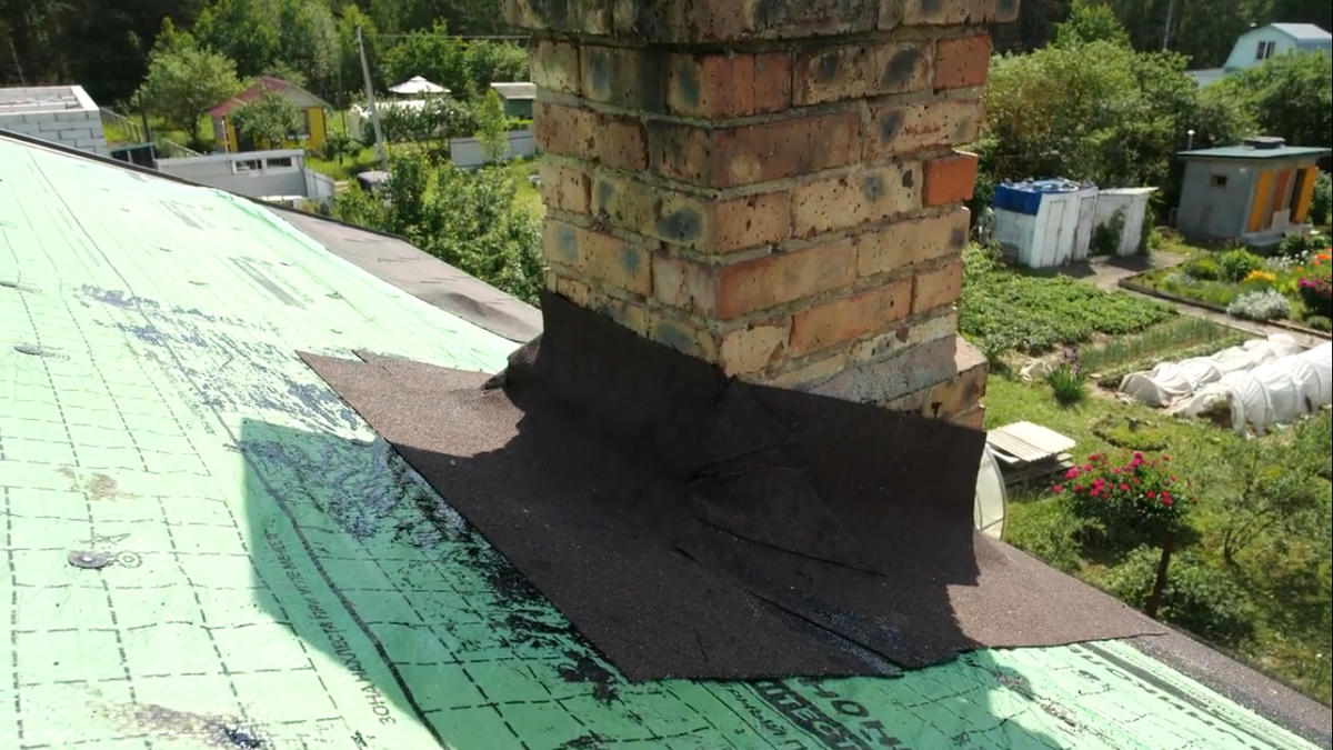 Еще один этап работ - это герметизация места примыкания печной трубы к крыше. Мы использовали ендовный ковер, обрабатывая его мастикой Фиксер.