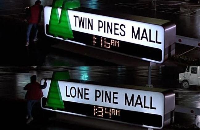 4. Мало кто заметил, что в начале фильма Марти встречает Дока на парковке торгового центра "Две сосны". В новом 1985 году, куда пребывает Макфлай после своего путешествия, магазин называется "Одинокая сосна". Потому что одно дерево Марти сбил на ДеЛориане в 1955 году.
