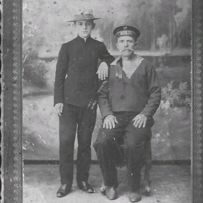Эта фотография сделана в 1916 году китайским фотографом во Владивостоке. На ней в форме матроса мой прадед Климентий, а рядом в канотье мой двоюродный дед Иван перед своим отъездом в Америку.