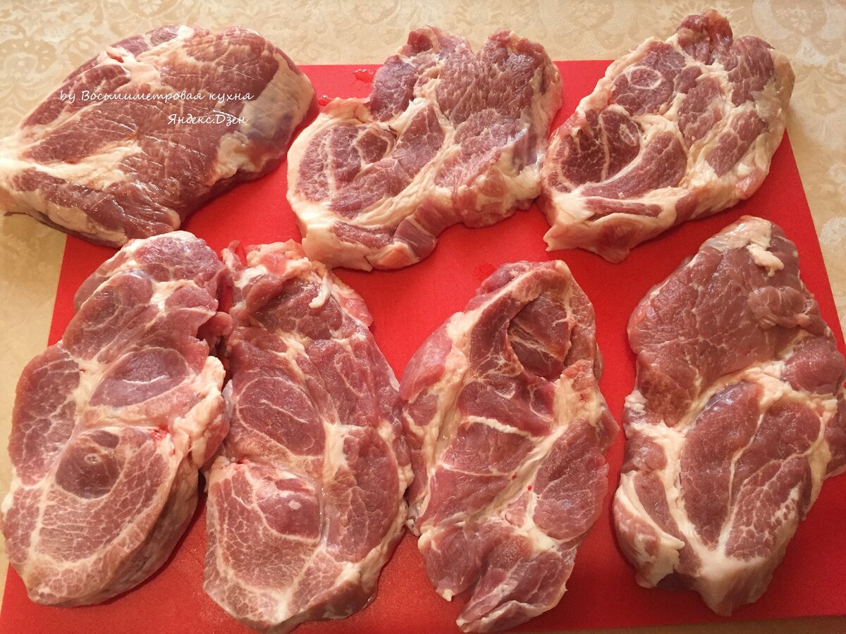 В супермаркете берем кусочек свиной шеи. Режем его на стейки толщиной 1.5-2 сантиметра: