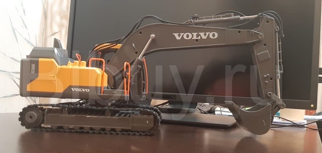 Масштаб радиоуправляемой модели 1/16. Пультом можно управлять на расстоянии 25 метров. Для пульта потребуется докупить 2 батарейки типа АА. При покупке экскаватора в магазине Бибай - батарейки Вы получите в подарок.