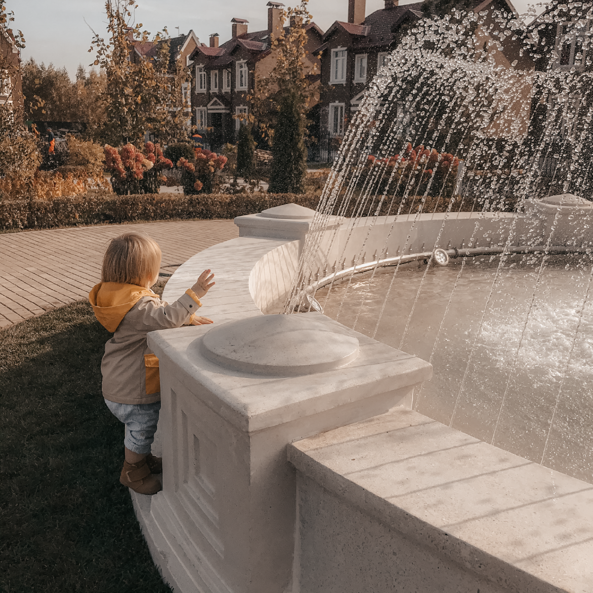 Фонтан. Судя по реакции детей, фонтан, который недавно появился в конце главной аллеи, — это одно из лучших развлечений, которое смогли придумать в администрации посёлка. Когда на улице темнеет, вода подсвечивается разными цветами!