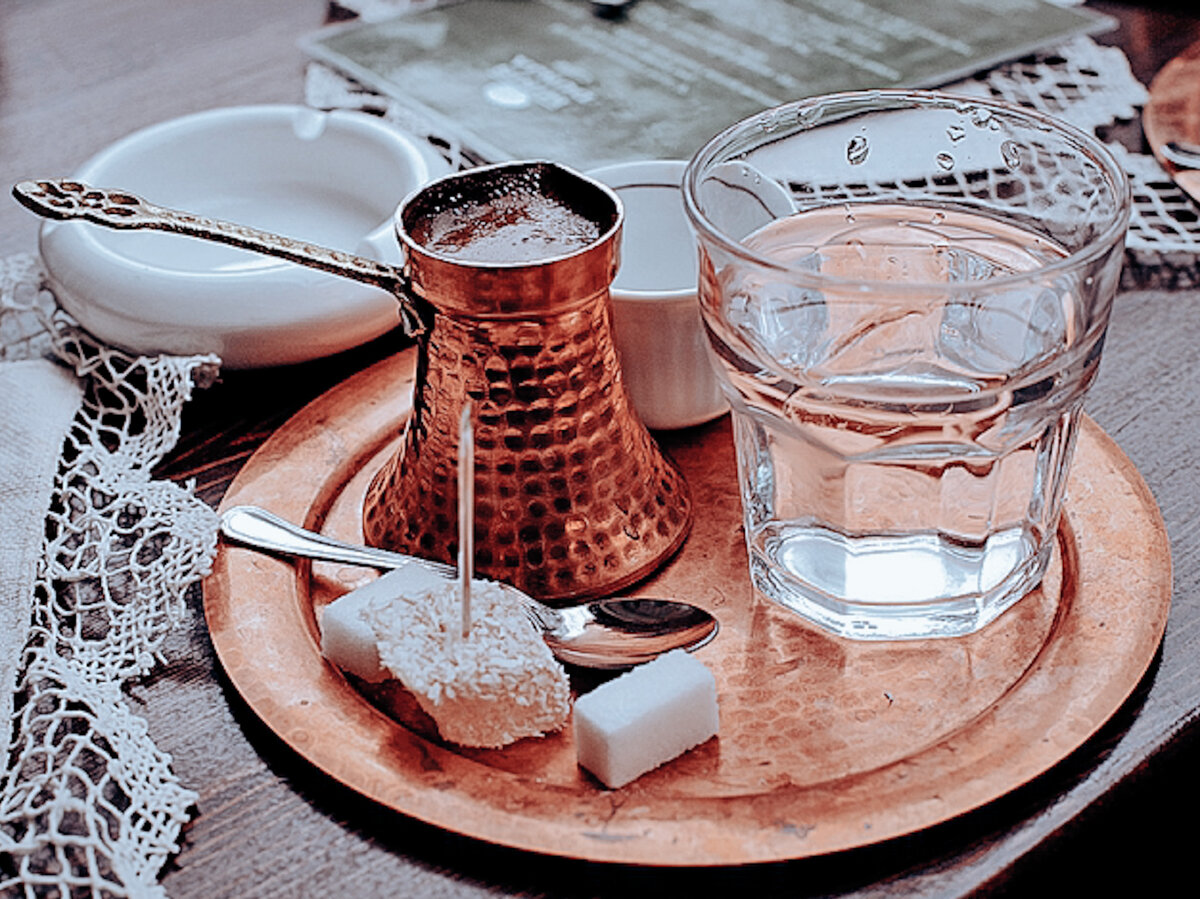 Турецкий кофе подают в маленьких чашечках, нередко со стаканом чистой воды.