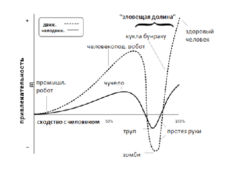 Например, к промышленному механизму — роботизированной руке, совершенно не похожей на человеческую, — мы относимся нейтрально. По мере продвижения по оси «человекоподобия» мы находим робота-гуманоида. Подсознательно приписывая ему человеческие характеристики, мы воспринимаем его более привлекательным. Но если объект находится слишком близко к «позиции настоящего человека», это заставляет нас беспокоиться. Мы уже определили этого робота как человека, но малейшая неестественность выбивает нас из колеи. Наше положительное восприятие попадает в «зловещую долину».