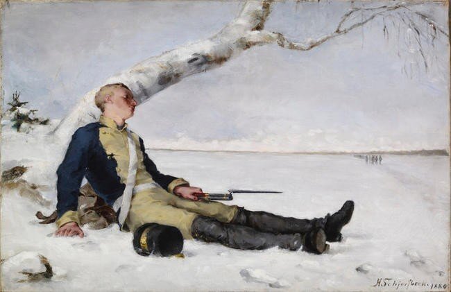 Еще раз внимательно смотрим на картину. Зима. Белый холод. Где – то в дали люди. Кто они? Свои, чужие? Светло серое пространство. Одинокая спокойная и прекрасная фигура солдата. Он еще жив. На лице румянец. Но солдат понимает, что обречен. Не делает попыток спастись. Хотя, вдали виднеется отряд. Он уже смирился со своей участью и принял ее как должное без трагизма. Такой же обреченностью и одиночеством была пронизана и жизнь художницы. Неудавшаяся любовь. Физические недостатки, заставившие замкнутся в себе. Но она до последнего оставалась мужественным солдатом искусства. Неудавшаяся личная жизнь, была её смертельной раной. С которой приходилось мириться и жить. Детей, которых боготворила, Хелен рожала на полотнах и безмерно их любила. Образы мужчин и женщин на портретах становились ее братьями и сестрами. Поскольку в них была вложена частичка её души. Она, смогла до конца сохранить девственность в искусстве. Что дало повод сделать вывод, что свою миссию Хелен, выполнила. Она и есть тот виртуальный солдат, которого некогда создала и любила. И это она в холодном одиночестве красиво умирала каждый день в течении всей своей жизни. А мы наполняемся и радуемся чистотой её энергии и таланта