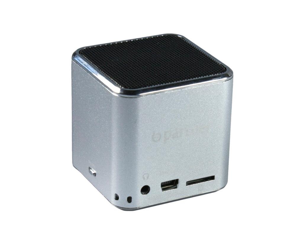 Небольшая колонка с прочным металлическим корпусом кубической формы в минималистичном виде. Поверхности глянцевые, серебристого оттенка.