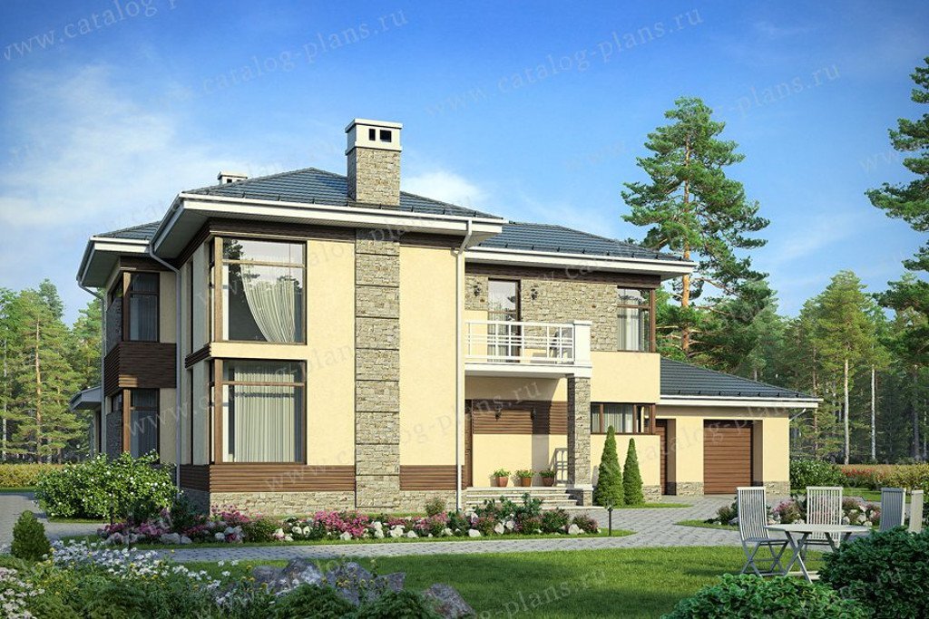 Панорамные окна, большая площадь остекления, сочетание различных фактур на фасаде, - все это делает проект уникальным. Особенностью проекта является наличие веранды и гаража, рассчитанного на две машины. Такой дом отлично подойдет для круглогодичного проживания большой семьи. Несущие стены выполнены из кирпича. Проектом заложен монолитный железобетонный фундамент, перекрытия так же монолитные железобетонные.