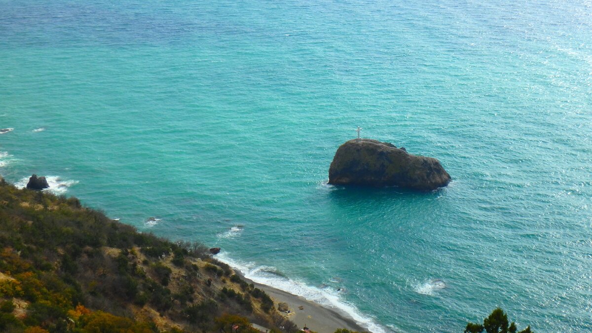 И конечно же, наше внимание привлекла скала «Святого Явления» с белым крестом на вершине. Она является визитной карточкой Яшмового пляжа.