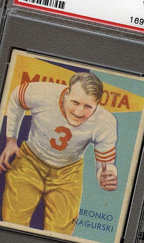Нагурски, Бронко (1908 - 1990 года). Профессиональный игрок в американский футбол, родом из Канады. Почти всю карьеру он провёл в клубе Чикаго Бэарз, а также являлся реслером. Футболист трижды вместе со своей командой побеждал в НФЛ. В команде он являлся грозной силой и играл как на своей, так и на чужой половине поля. В 1935 году выпущено всего 36 карточек, на которых Бронко ещё учится в колледже Миннесоты, хотя в это время он уже играл Чикаго Беарз. Такое несоответствие и придало карточке популярность, а в следствие чего и большую стоимость.