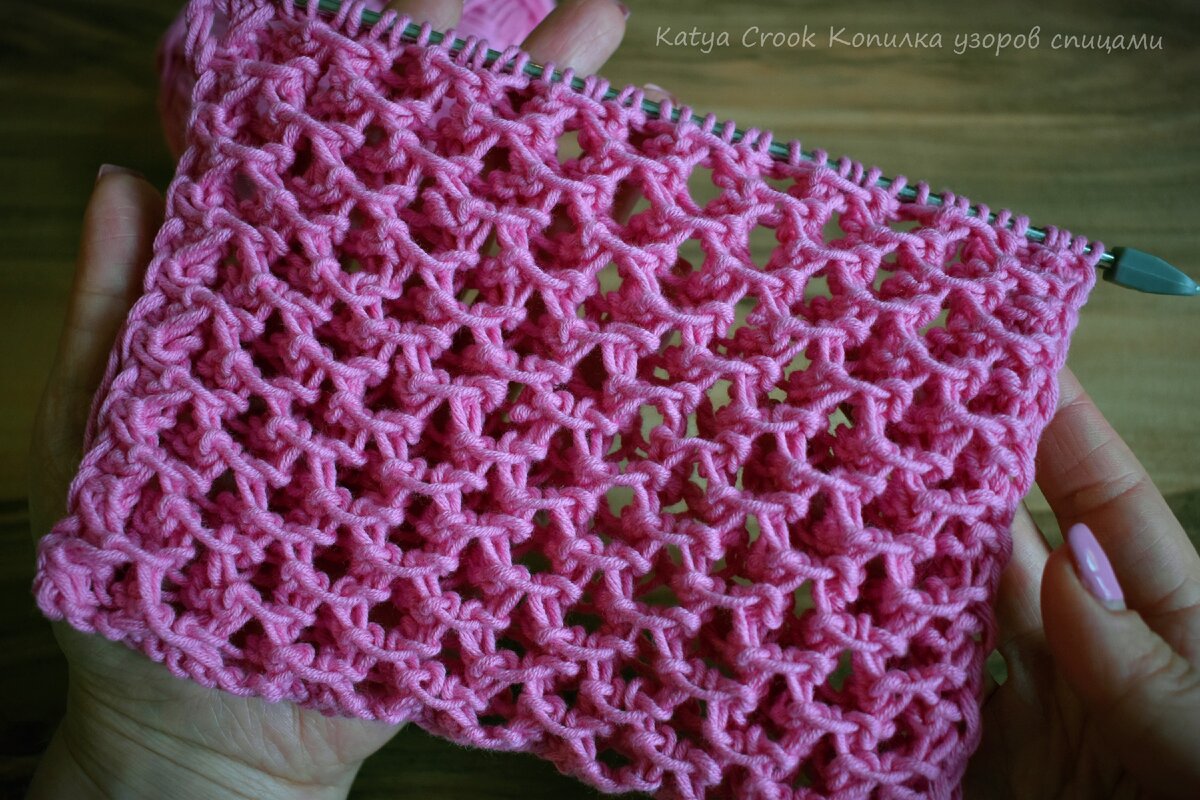 Доброго времени суток, дорогие рукодельницы! Пополняем нашу коллекцию узоров! Вяжем очень объемную сеточку спицами. Выглядит такой узор безумно красиво, на ощупь - мягкий, легкий как пушинка! И очень-очень объемный! Красиво и стильно будет смотреться на любом изделии из любой пряжи, но особенно, на мой взгляд, из тонкой). По виду узор напоминает соты или ячейки, форму держит умеренно. Вяжется достаточно просто - раппорт - 6 петель и 4 ряда. ВНИМАНИЕ: узор формируется на изнаночной стороне! Будьте внимательны! Итак, 1й и 3й ряды: *1 лиц с 2мя накидами.* 2й ряд: *3 петли переснять, сбросив накиды, вернуть их на левую спицу и провязать каждую лицевой в обратном порядке (сначала 3ю, затем 2ю и 1ю), 3 петли переснять, сбросив накиды, вернуть их на левую спицу и провязать каждую лиц скрещ (за заднюю стенку) в обратном порядке (сначала 3ю, затем 2ю и 1ю).* 4й ряд: *3 петли переснять, сбросив накиды, вернуть их на левую спицу и провязать каждую лиц скрещ (за заднюю стенку) в обратном поря