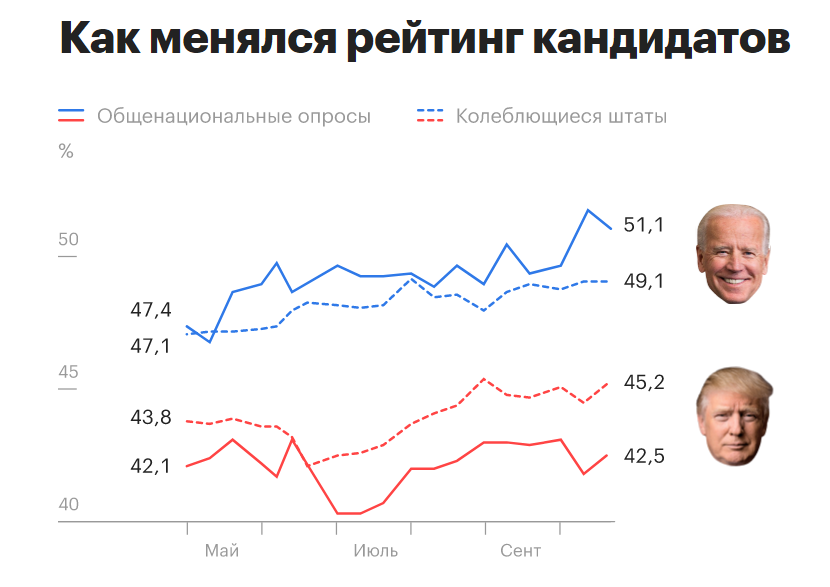 Выборы президента в США запланированы на 3 ноября 2020 года. Свежие рейтинги, опубликованные в Америке, отдают предпочтение Байдену.За него готовы проголосовать 51,1% американцев, а за нынешнего президента всего 42,5%.