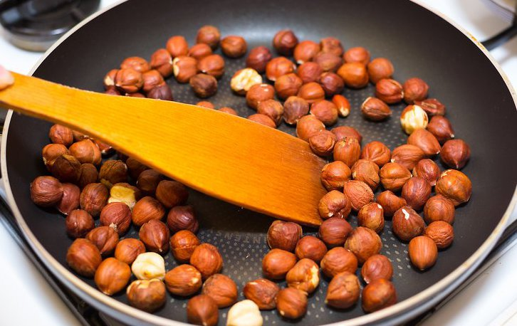1. Для начала возьмём сковородку и обжарим фундук.