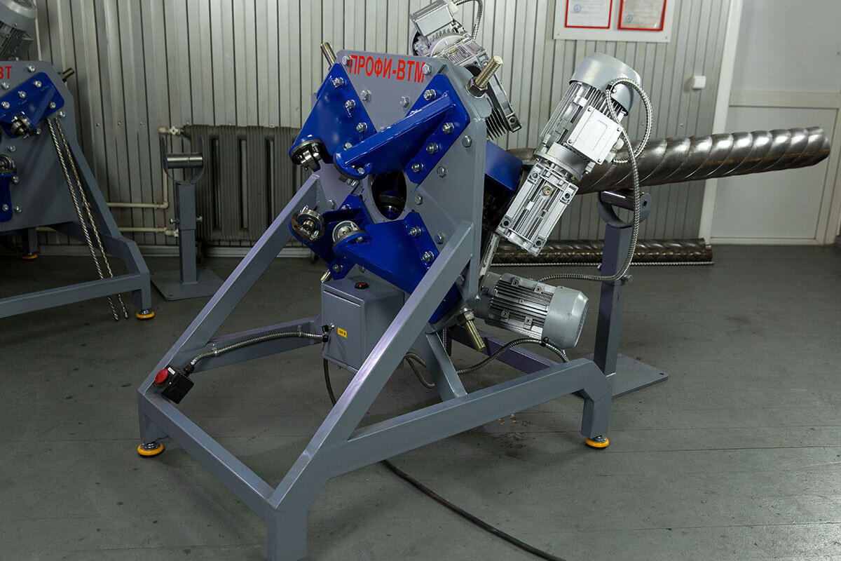 Создав станок «ПРОФИ-ВТ», мы решили немного пофантазировать над тем, как можно его еще улучшить, какими дополнительными свойствами «наградить». В итоге, добавив дополнительный накатный ролик, мы получили станок «ПРОФИ-ВТМ», который наносит рисунок «Косичка» в 4 борозды. Визуально такой рисунок стал выглядеть более плотно, чем 3-х бороздовая навивка при тех же углах подъема витка. При этом, возросшая мощность нового станка (за счет дополнительного мотор-редуктора) позволила увеличить максимальную толщину обрабатываемой трубы до 4,5 мм.