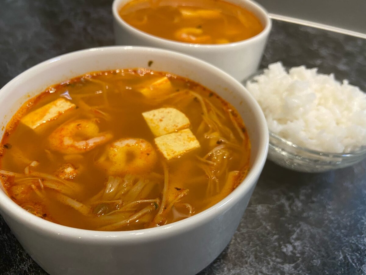 Я честно говоря не помню где мы его попробовали впервые... Но с тех пор мы довольно часто его готовим, и он довольно вкусный, и очень легко готовиться. Я не знаю точного названия, и не нашёл подобного в интернете! Поэтому можете написать в комментариях название, если кто знает, а так я называю его Суп с морепродуктами и пастой кочудянг!