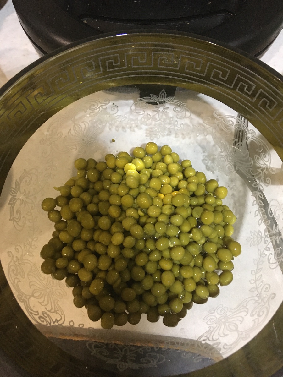 - открываем банку с горошком, сливаем водичку и высыпаем его в салатник ( глубокую тарелку)