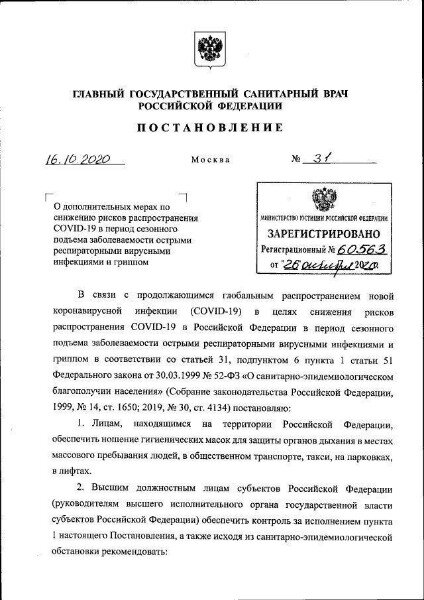 Управление Роспотребнадзора РФ в лице главного санитарного врача 26.10.2020 года приняло очередное постановление о дополнительных мерах по борьбе с самым "популярным" вирусом этого года. Вот его текст: