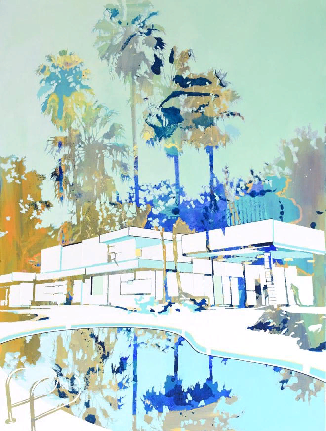 Когда Пол, его жена Сара и их сын Арло вернулись в Австралию после шести лет в Лос-Анджелесе в декабре прошлого года, молодая семья переехала прямо сюда! Пол устроил свою студию на нижнем этаже и принялся за работу, создавая картины, которые сейчас выставлены в галерее Софи Гэннон. Space Displaced-это серия из 11 работ, каждая из которых изображает архитектурно значимые объекты вокруг Северной Америки.