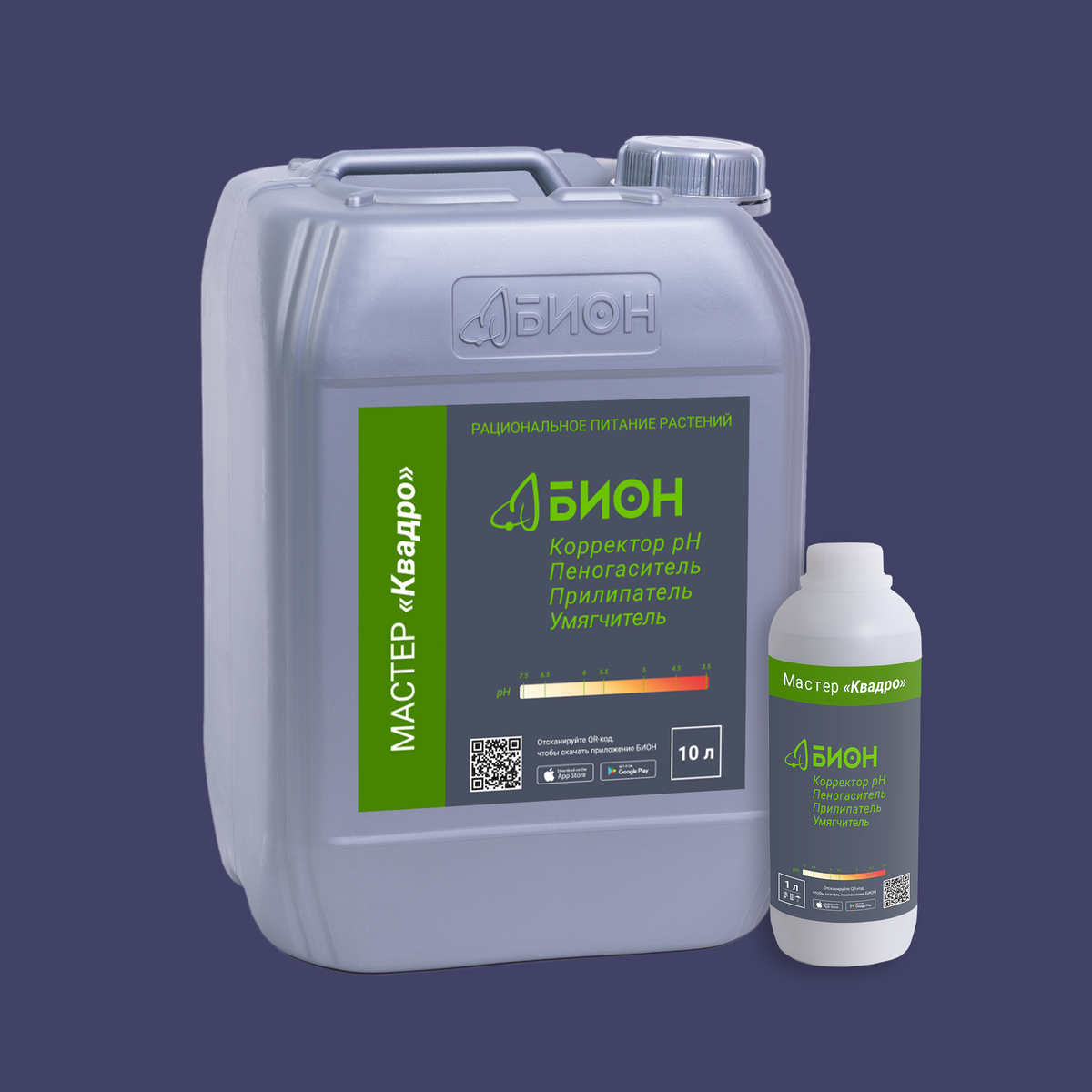 БИОН Мастер Квадро – специальный препарат, улучшающий качество воды для опрыскивания и повышающий результативность химических обработок и листовых подкормок растений. Он обладает четырьмя свойствами, необходимыми для подготовки воды при приготовлении рабочего раствора: