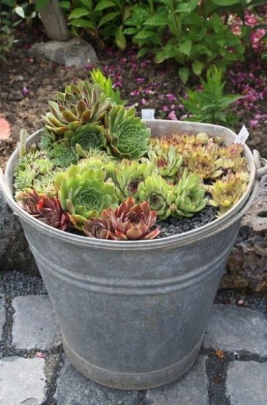 Очень привлекательно выглядят растения в ведре. Особенно если они небольшие как на картинке выше.