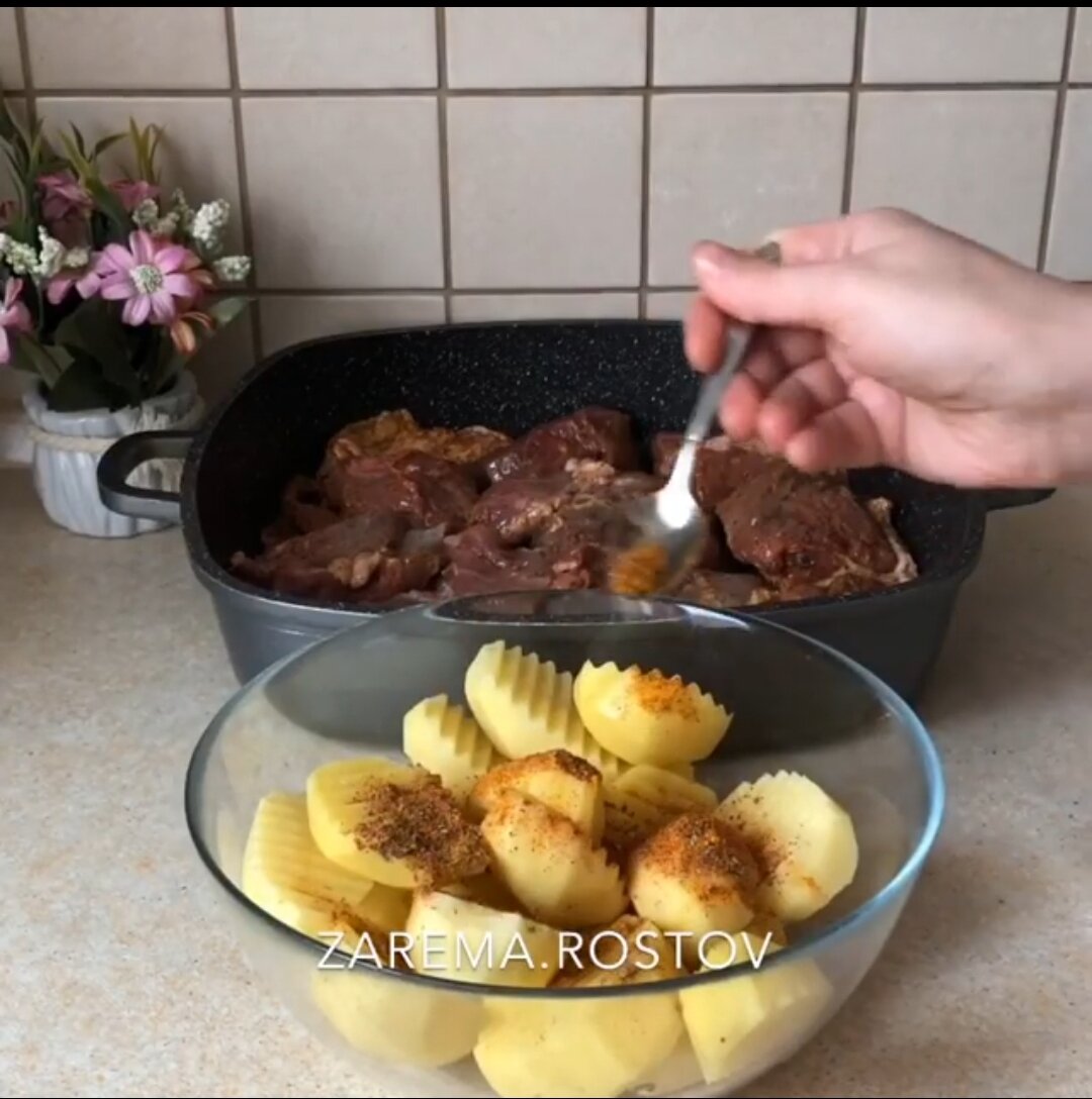 Мясо я взяла мякоть.Добавила соль по вкусу,куркуму,чёрный перец,Чили,паприку,горчицу.Хорошо перемешала и оставила мариноваться на 6 часов.🥰В картошку добавила те же специи за исключением горчицы и добавила ложку оливковое масло,перемешала и вместе с мясом переложила в форму для запекания.Закрыла крышкой(можно фольгой)и поставила в разогретую до 180 градусов духовку на два часа.В самом конце сняла крышку и дала сверху подрумянится.